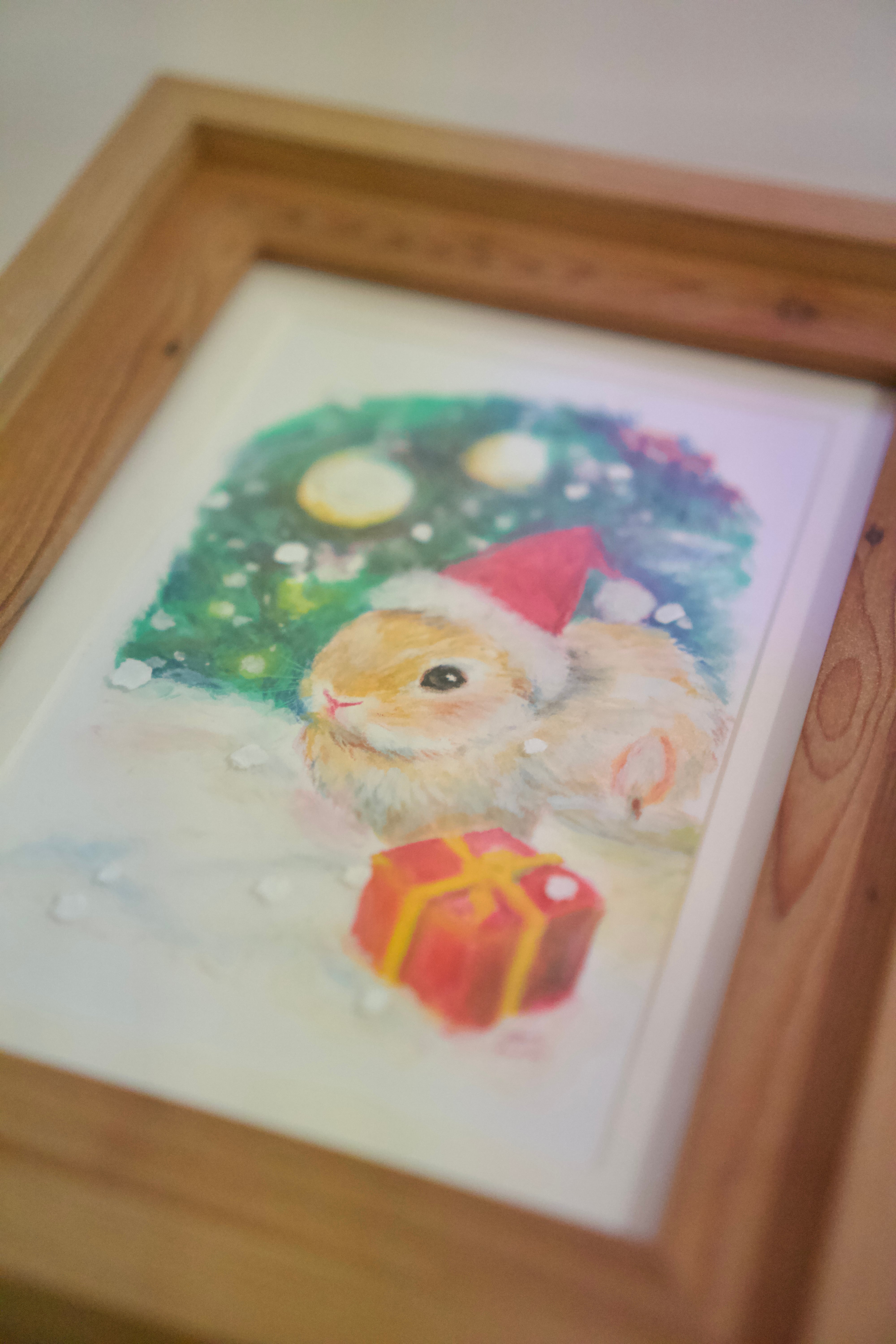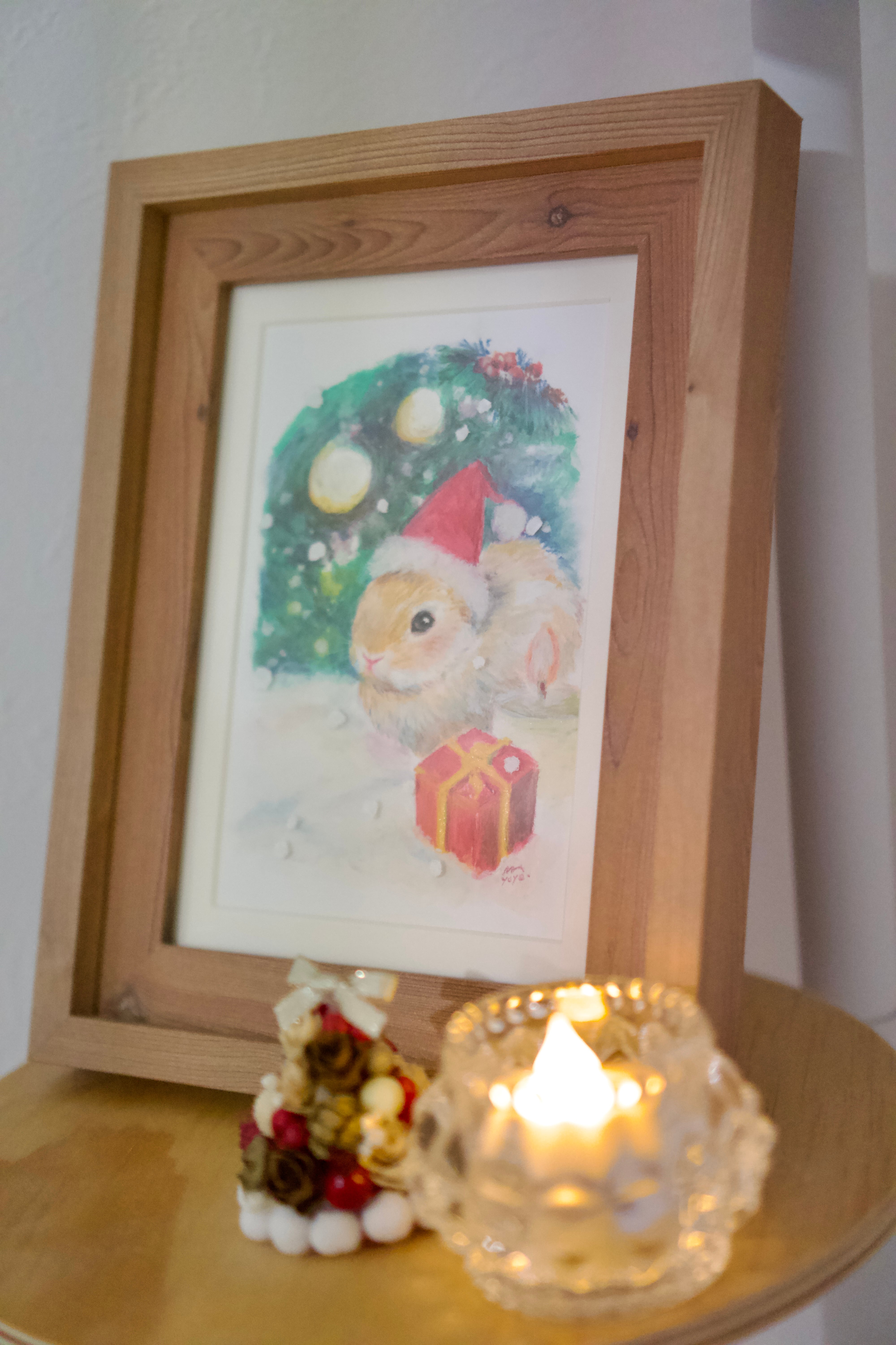 ツリーやキャンドル、プレゼントに囲まれ、初めてのクリスマスにちょっとドキドキしている表情の子うさぎさんをクレヨンで描きました。